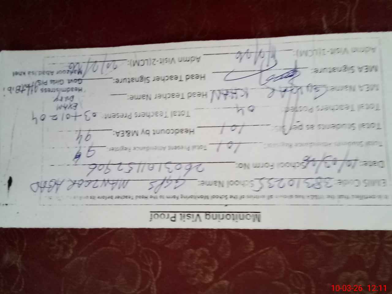 | Certified that this School was Inspected by the Undersigned MEA/DMO Today and the Information Stated Above is as Per Record. | |||||