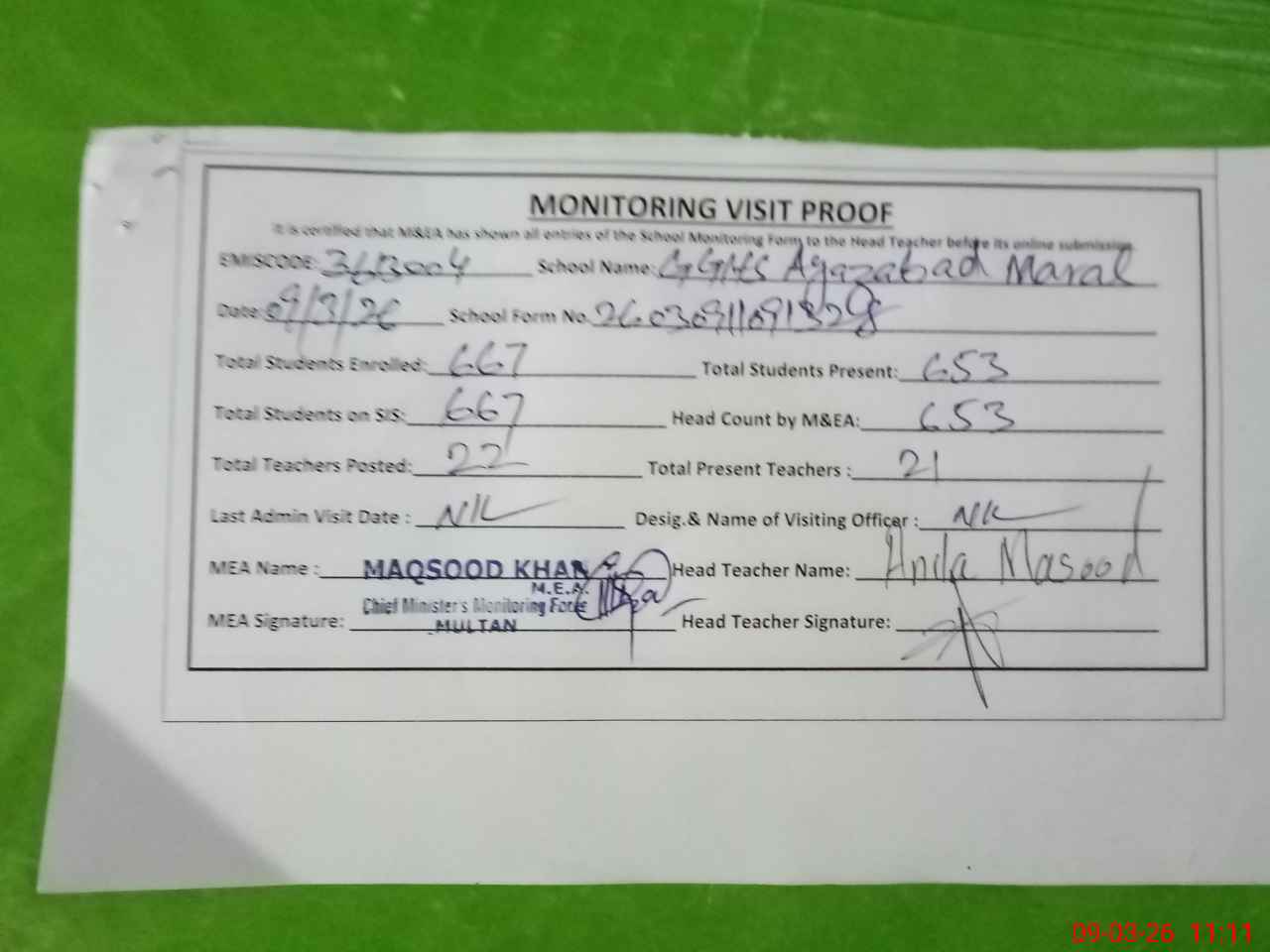 | Attendance Register | Head Teacher | MEA with School | Visit Proof |