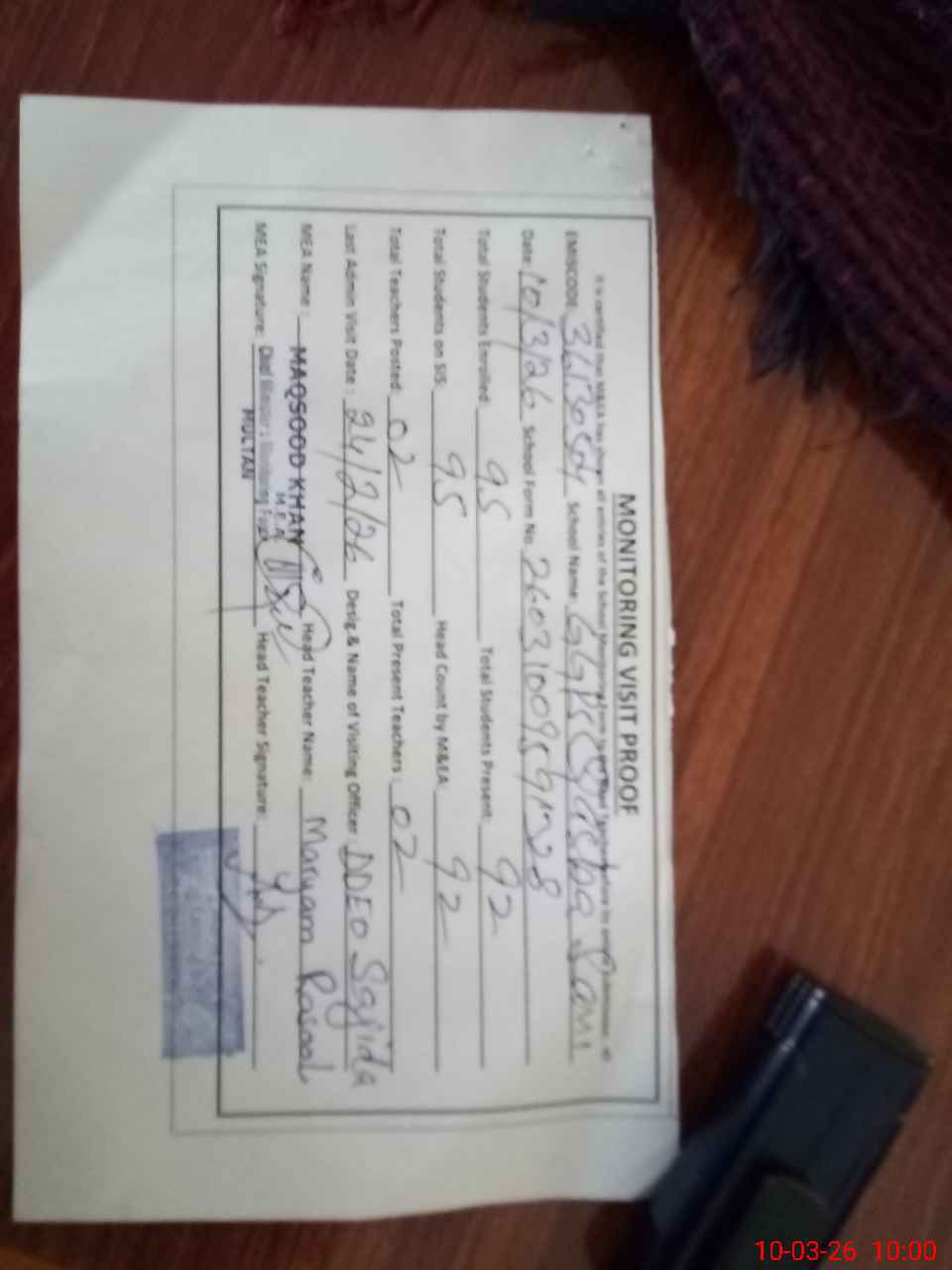 | Monitoring Date: 10-03-2026 | Start Time: 10-03-2026 09:50 AM | End Time: 10-03-2026 10:01 AM | Name of MEA: MA**** ULHA**** KH**** | |