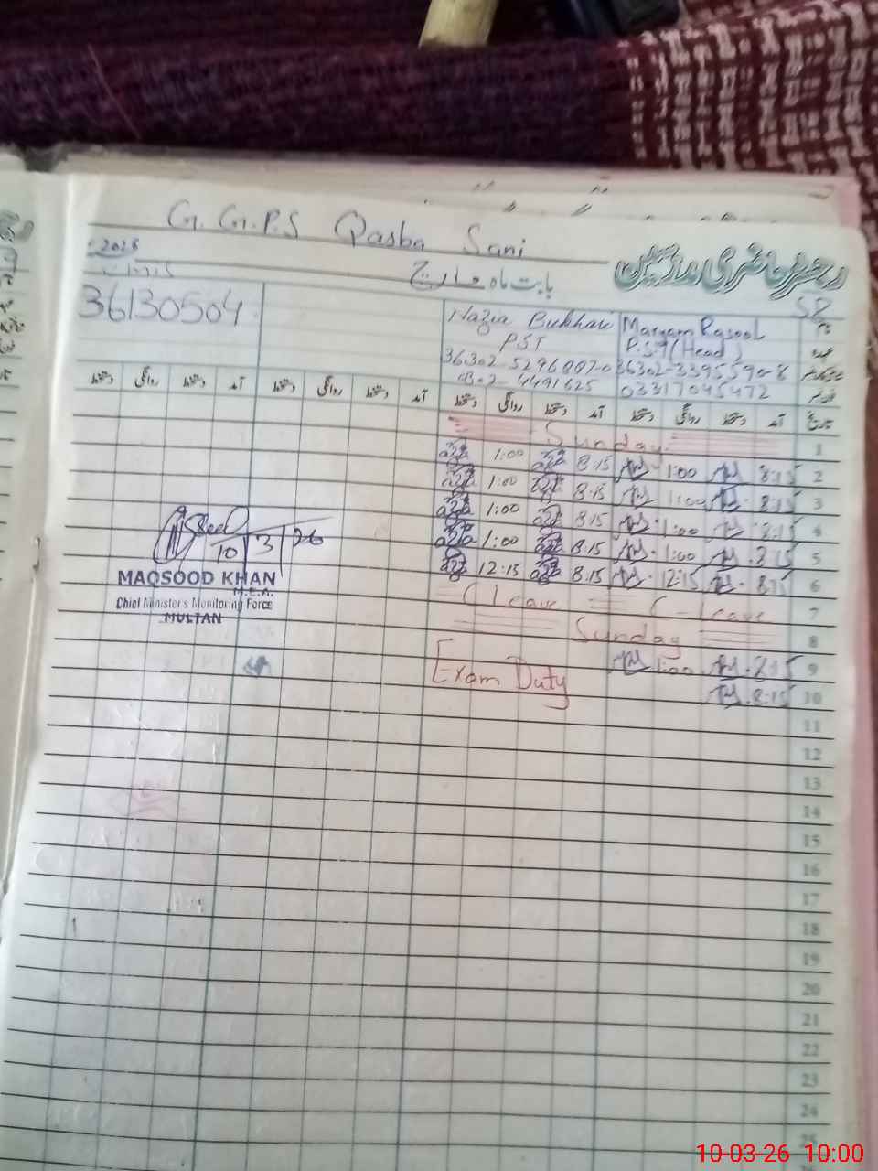 | 36**** | Na**** Bu**** | PST Arts | Regular | 0 | 0 | 0 | 0 | 0 | 0 | 0 | 0 | 0 | Exam Duty |