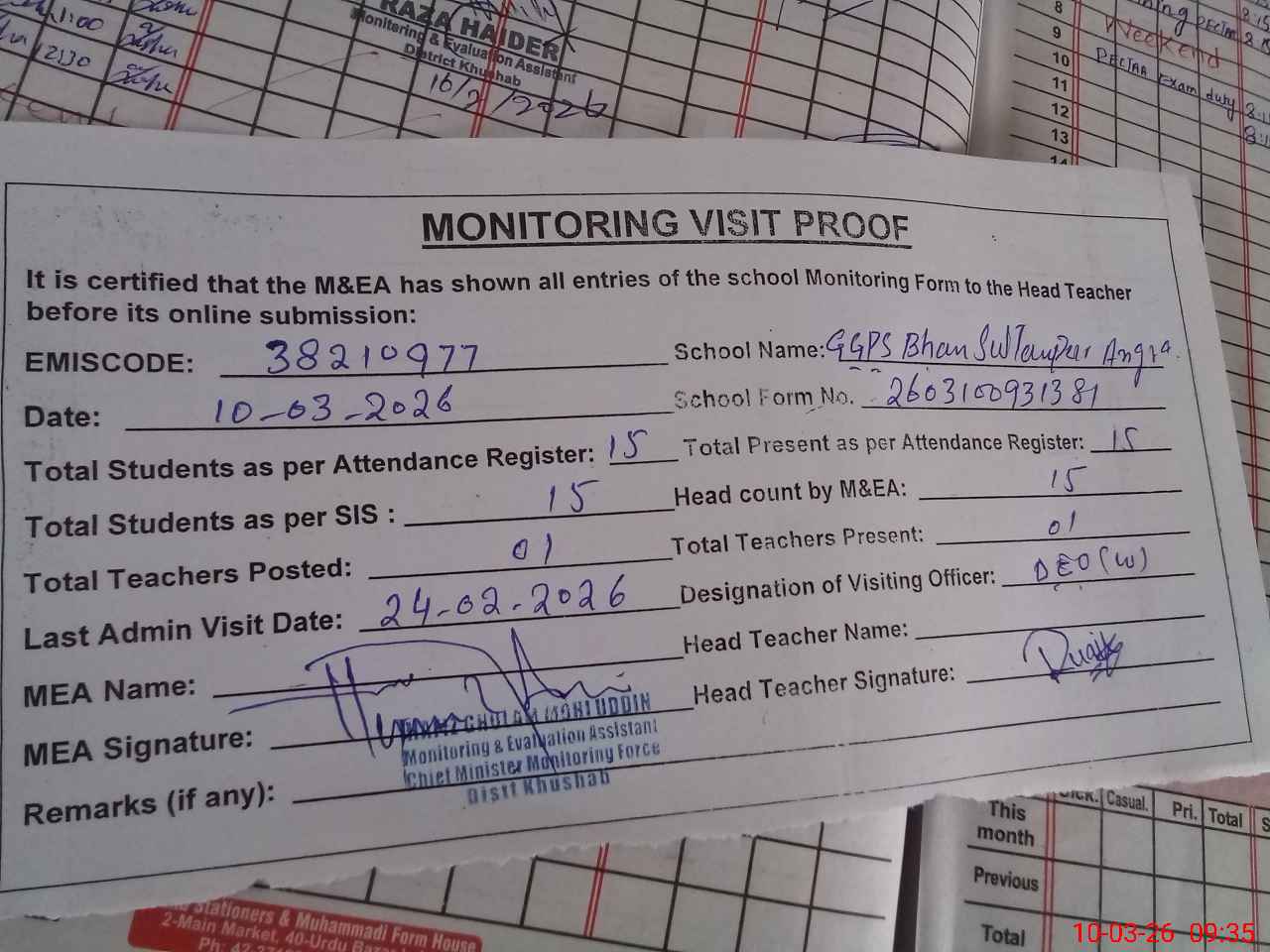 | Attendance Register | Head Teacher | MEA with School | Visit Proof |