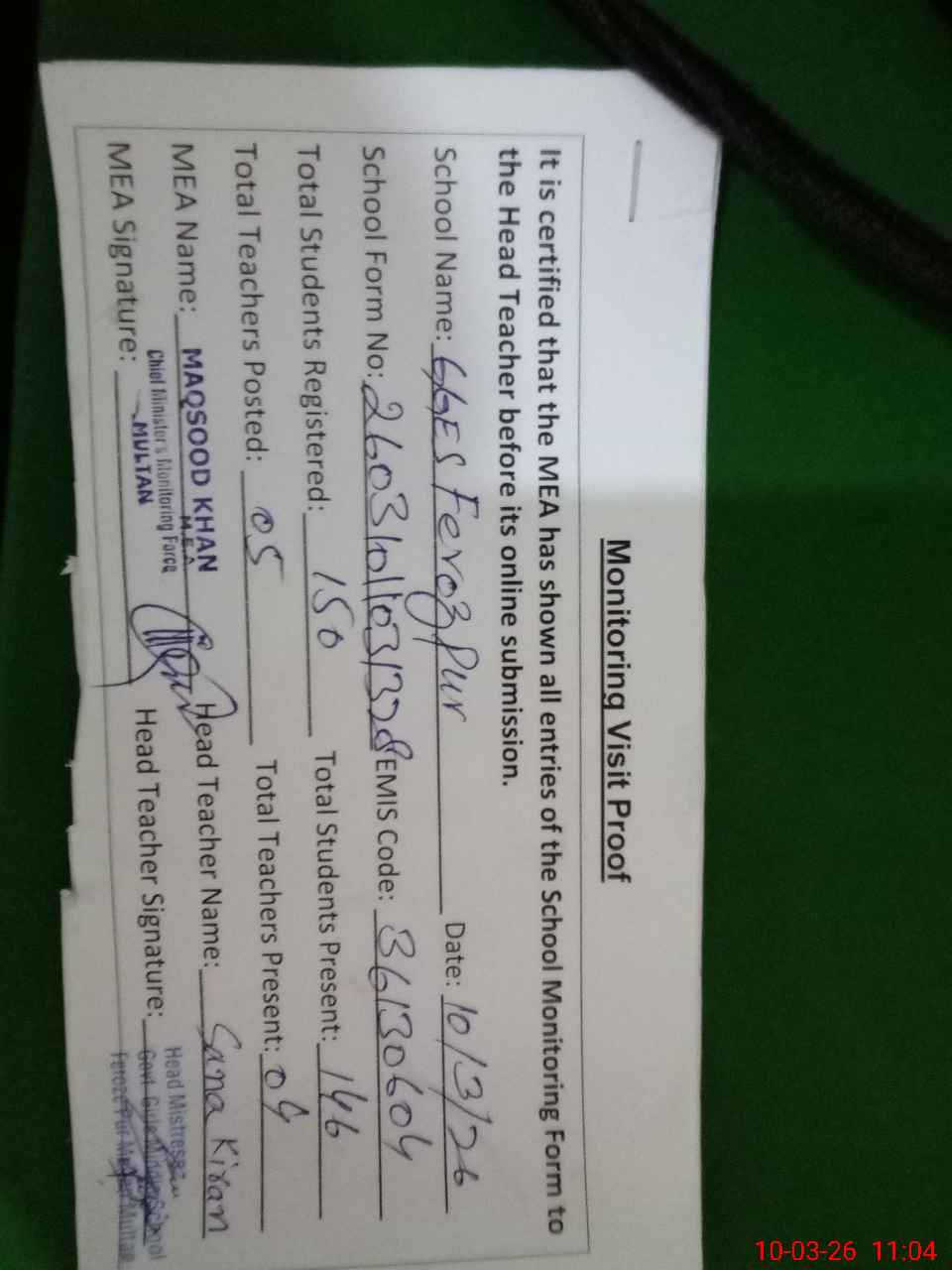 | EMIS Code: 36130604 | Name of School: GGES FEROZ PUR MULTAN | |||