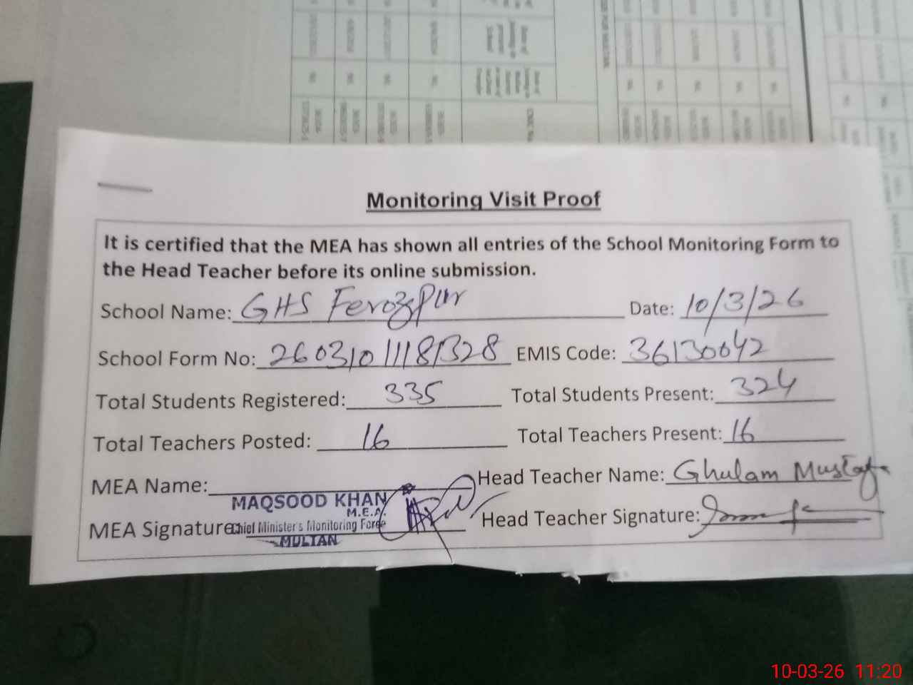| EMIS Code: 36130042 | Name of School: GHS FEROZ PUR MOUZA FEROZEPUR P/O SKINDRA ABAD TEH. & DISTT. MULTAN | |||
