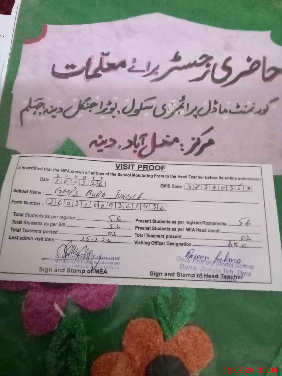 | Certified that this School was Inspected by the Undersigned MEA/DMO Today and the Information Stated Above is as Per Record. | |||||