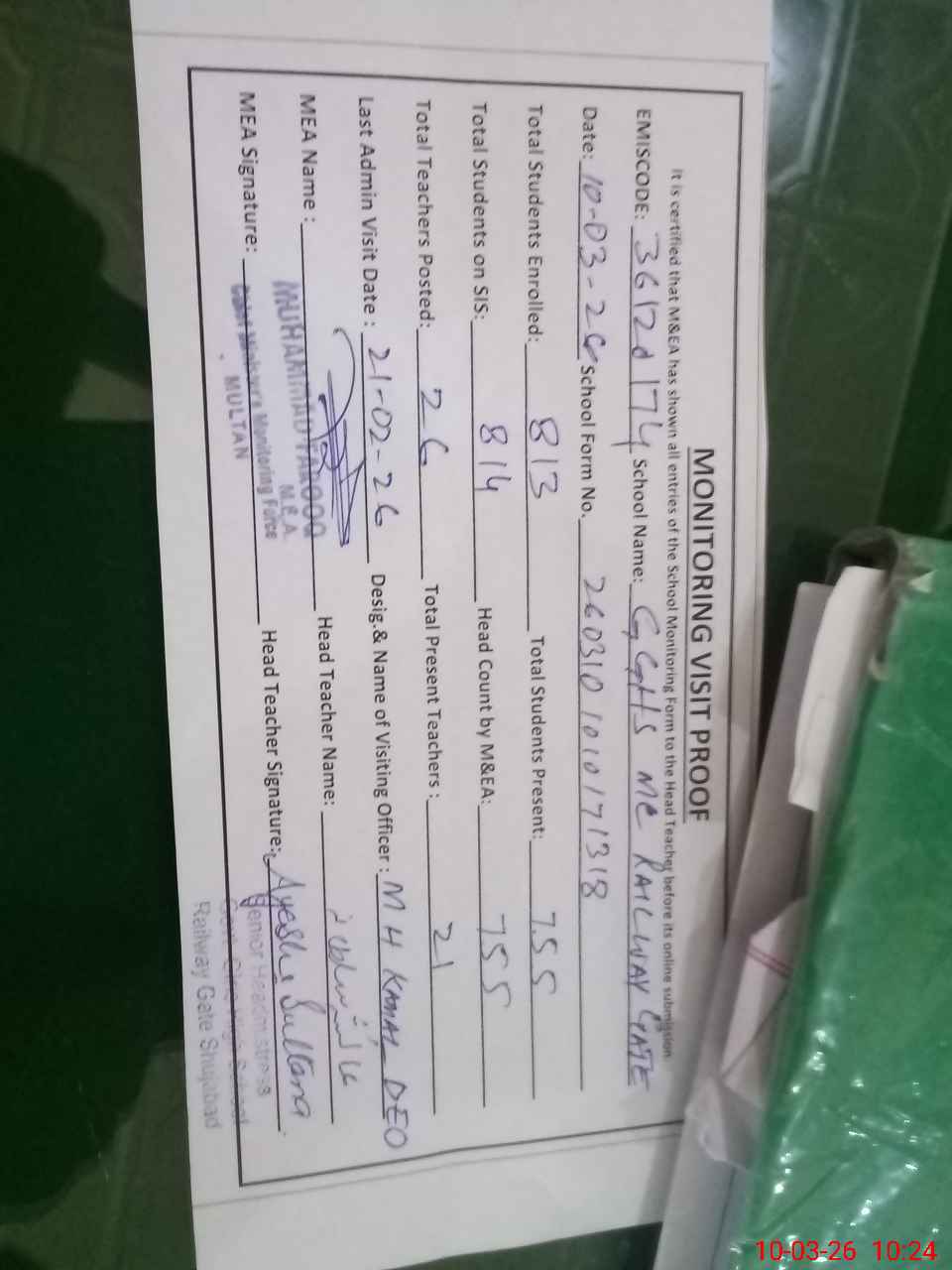 | EMIS Code: 36120174 | Name of School: GGHS MC RAILWAY GATE SHUJABAD | |||