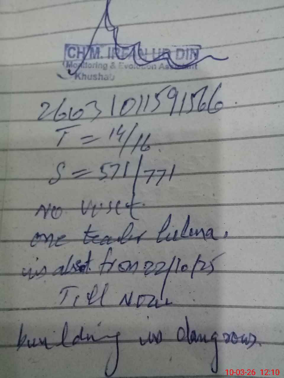 | Remarks (Use Separate Page if Required): gghs gungial still dent on sis 769 student on register 771 head count 571 no visit one teacher absent lubna from 22/10/2025 till now one teacher on leave 14 teachers are present science lab required computer lab equipment required 2 class room needed building is in dangerous condition needs immediate attention any mishap can happen any time as baramda of all class room in very dangerous | |||||