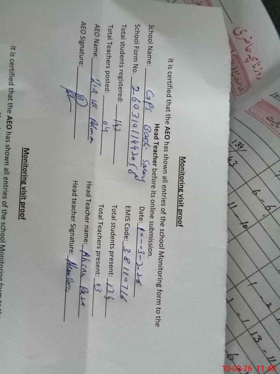 | Name: Ah**** Ra**** Designation: (School Headmaster's/Headmistress's) PST Phone/Cell Number: 03**** |
