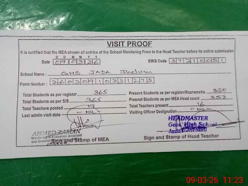 | EMIS Code: 37210051 | Name of School: GHS JADA JHELUM | |||
