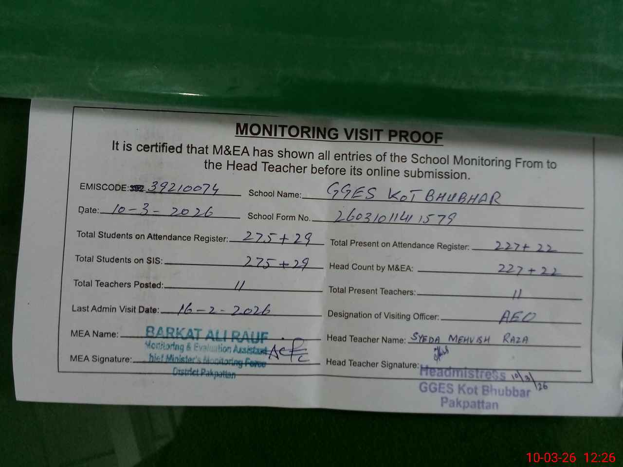 | Attendance Register | Head Teacher | MEA with School | Visit Proof |