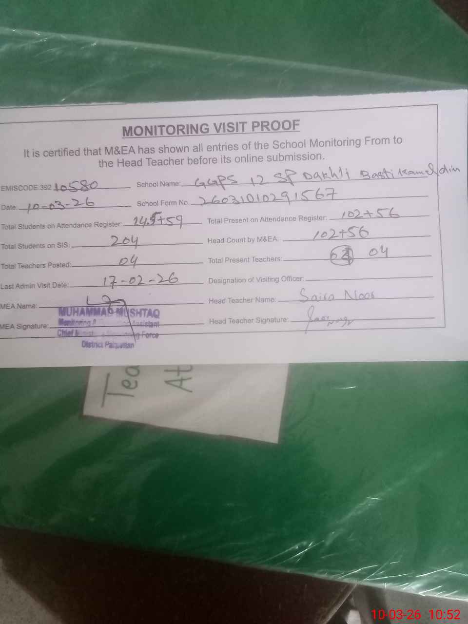 | Certified that this School was Inspected by the Undersigned MEA/DMO Today and the Information Stated Above is as Per Record. | |||||
