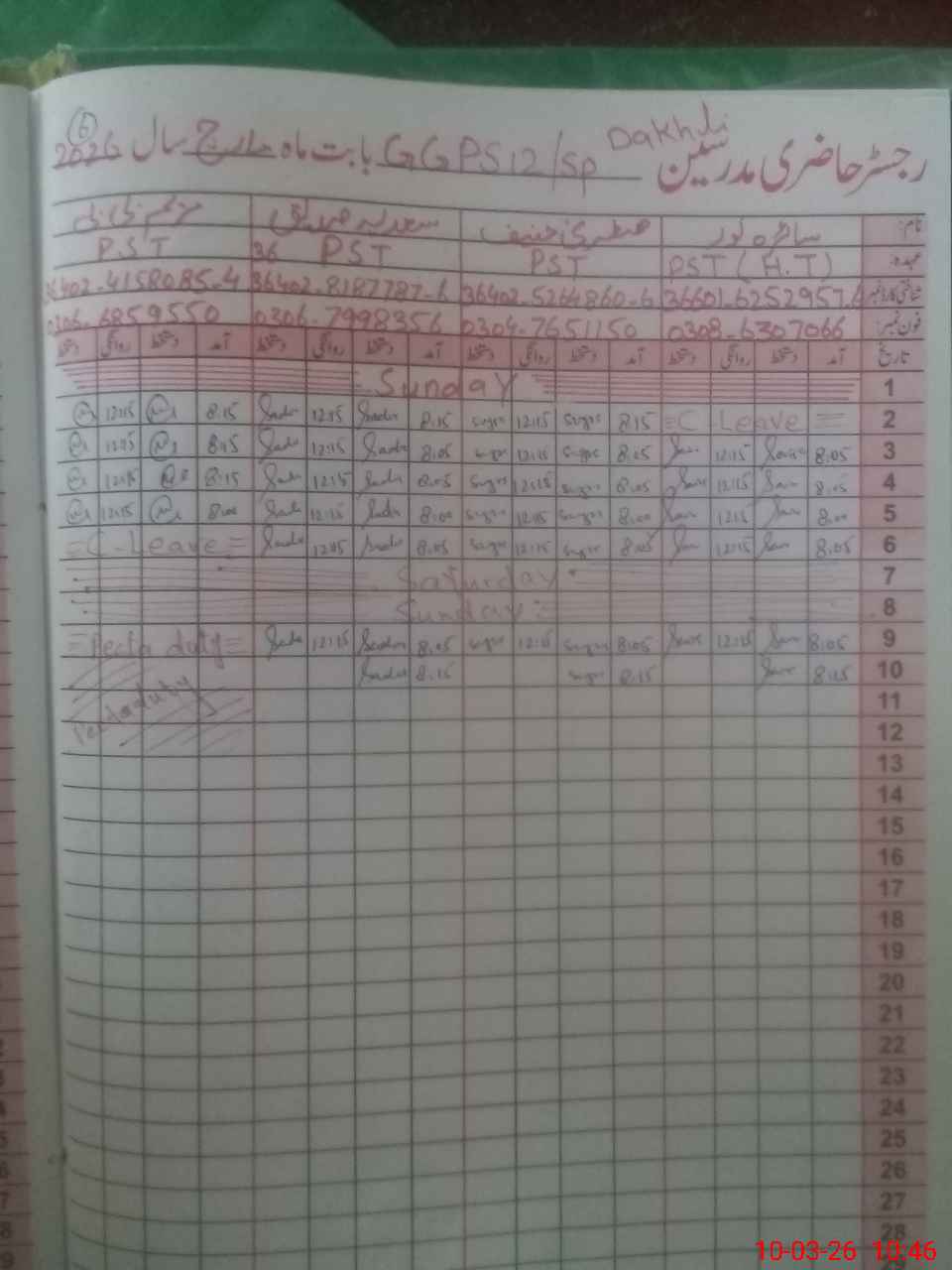 | Leave | Duty | Absent | Maternity | Medical | Ex- Pak |