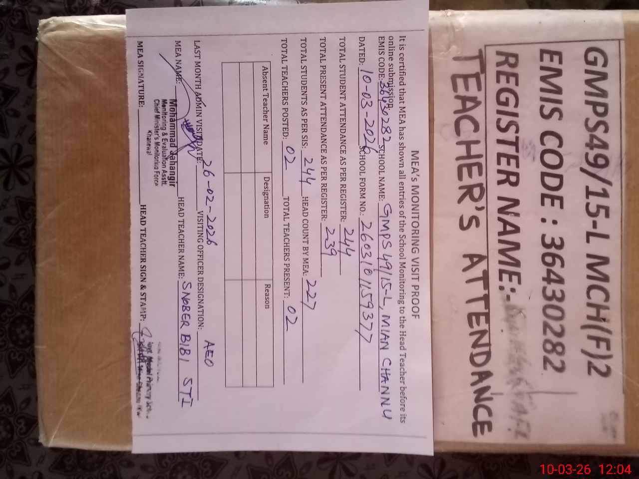 | Attendance Register | Head Teacher | MEA with School | Visit Proof |