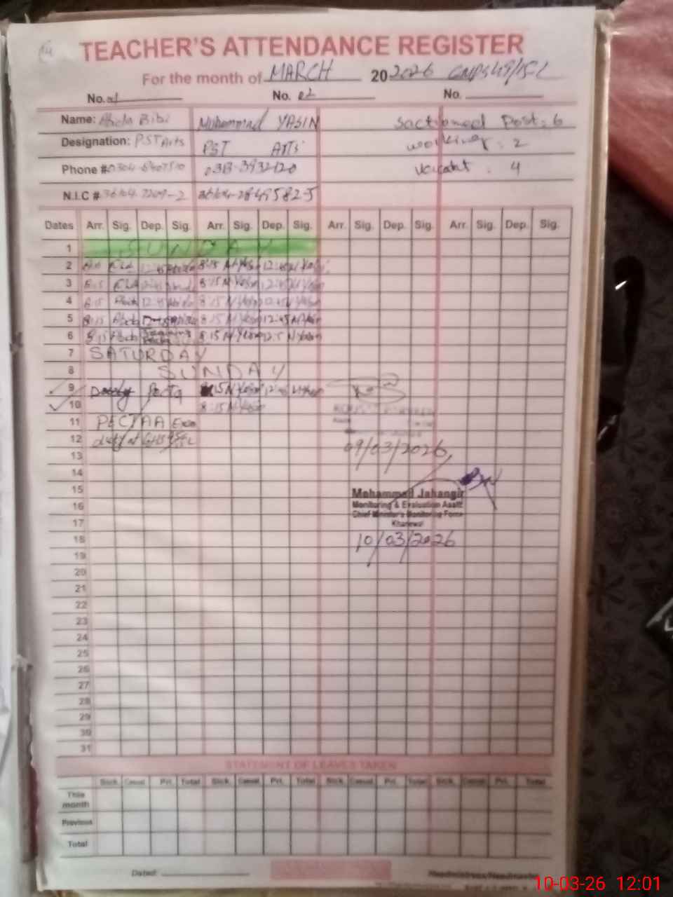 | Name: Ab**** Bi**** Designation: (School Headmaster's/Headmistress's) ESE (Arts) Phone/Cell Number: 03**** |