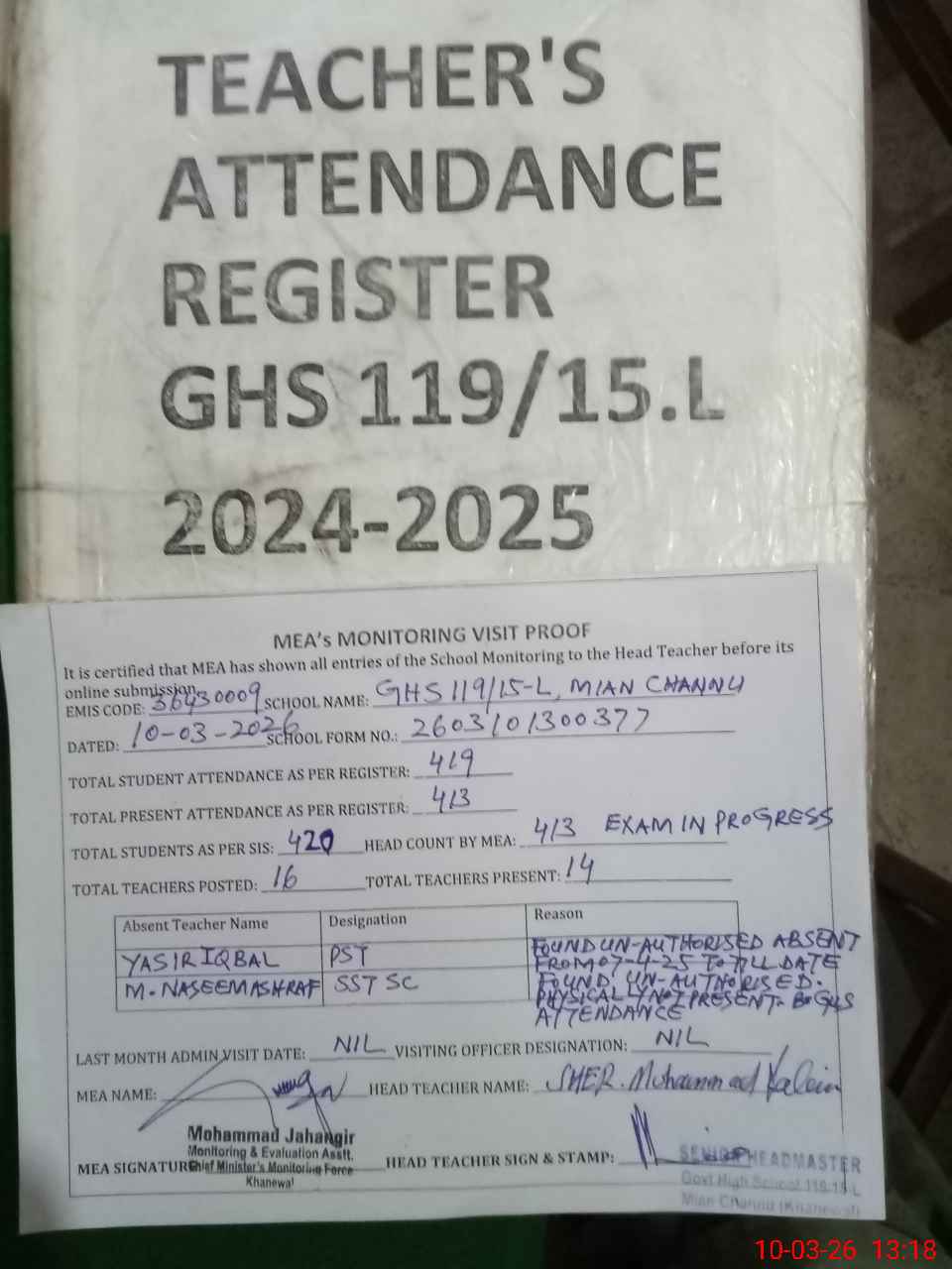 | EMIS Code: 36430009 | Name of School: GHS 119/15-L, MIAN CHANNU | |||