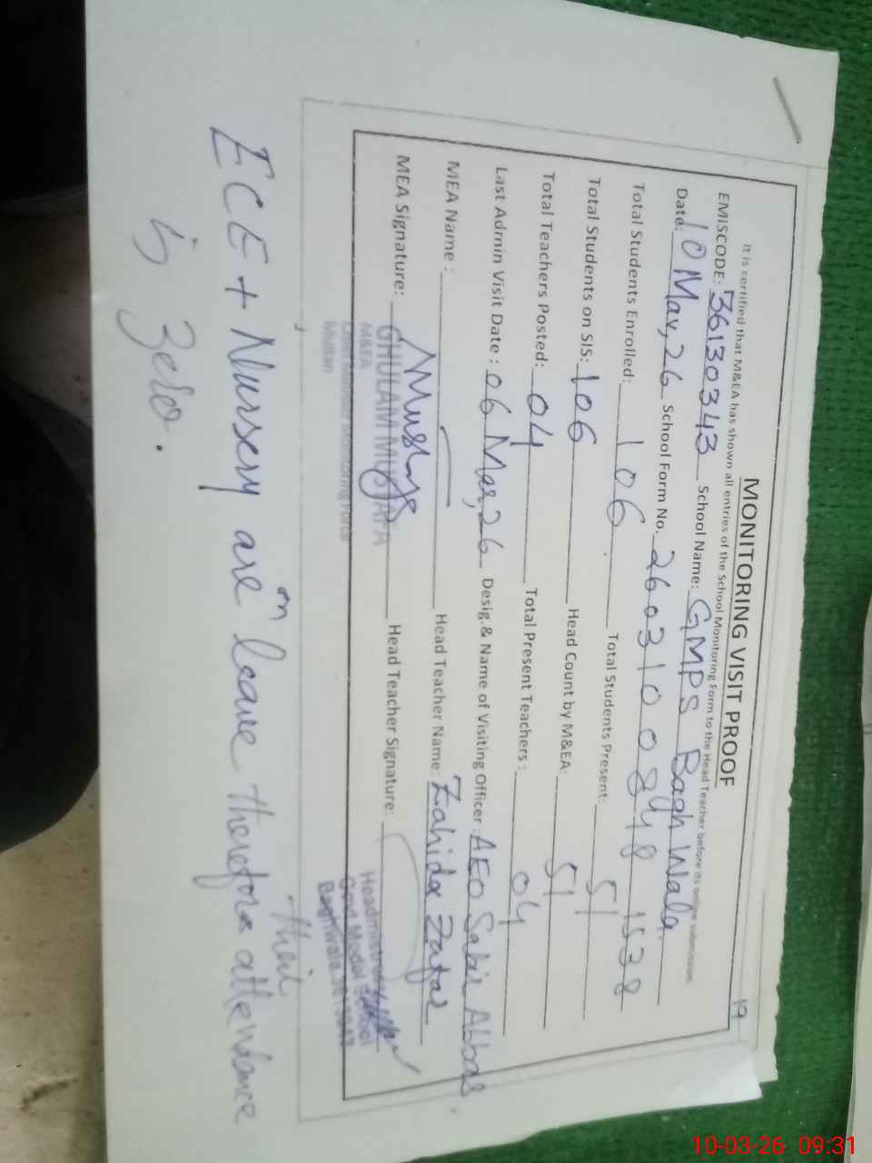 | EMIS Code: 36130343 | Name of School: GMPS BAGH WALA NEAR B Z UNIVERSITY | |||
