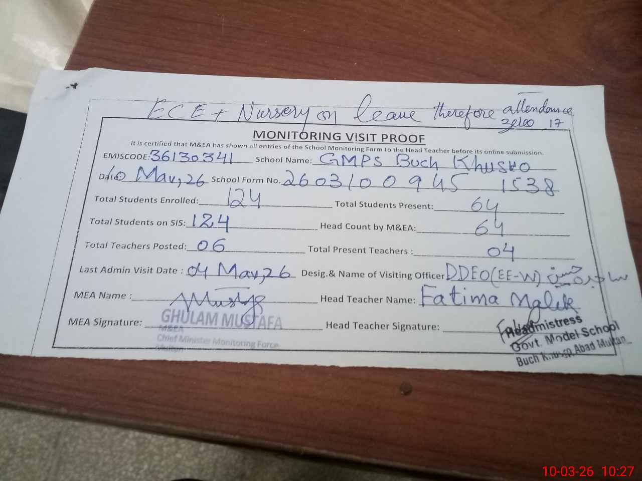 | Attendance Register | Head Teacher | MEA with School | Visit Proof |