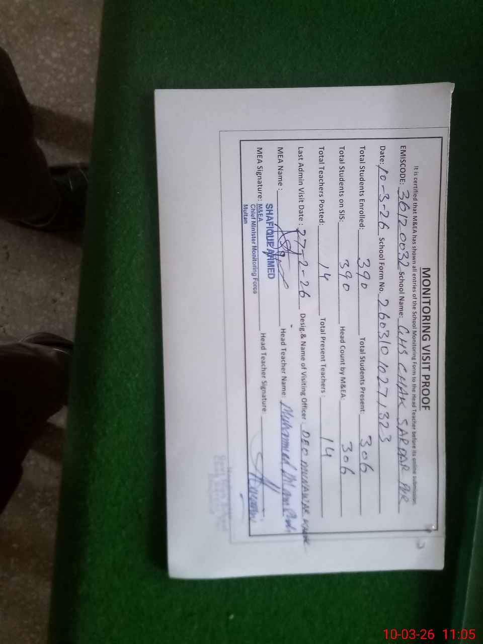 | Certified that this School was Inspected by the Undersigned MEA/DMO Today and the Information Stated Above is as Per Record. | |||||