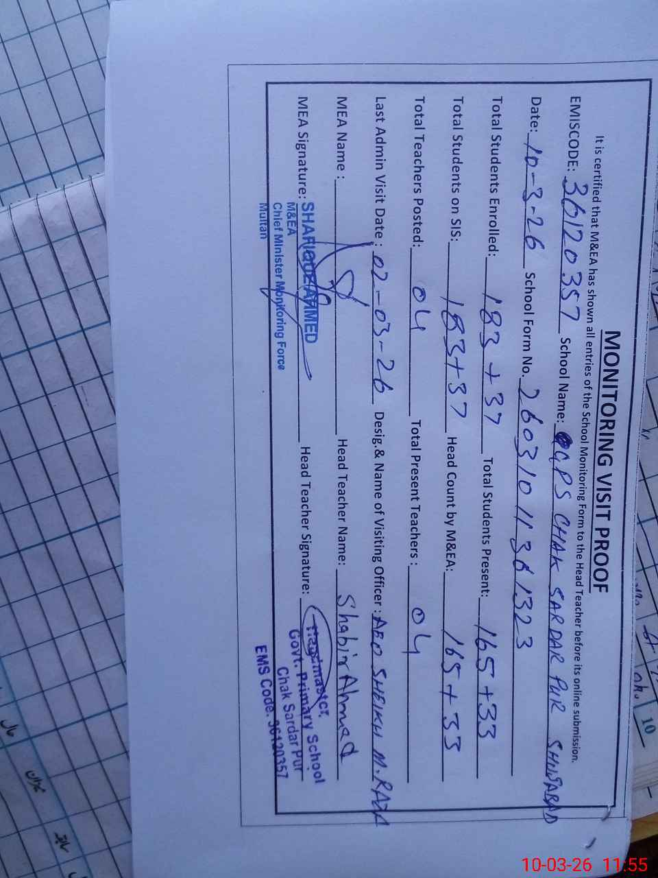 | EMIS Code: 36120357 | Name of School: GPS CHAK SARDAR PUR MOZA SHAH PUR UBHA | |||