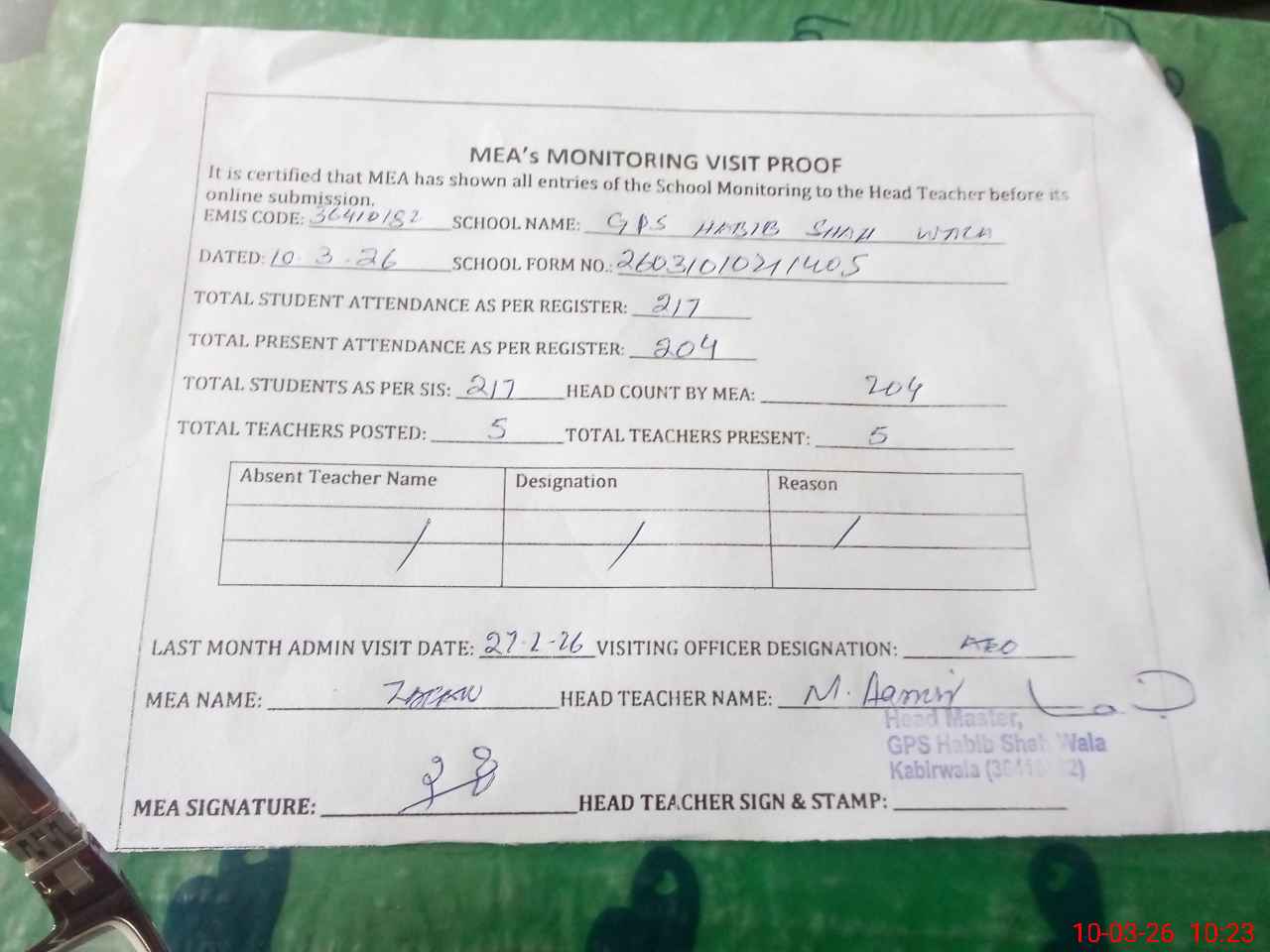 | Attendance Register | Head Teacher | MEA with School | Visit Proof |