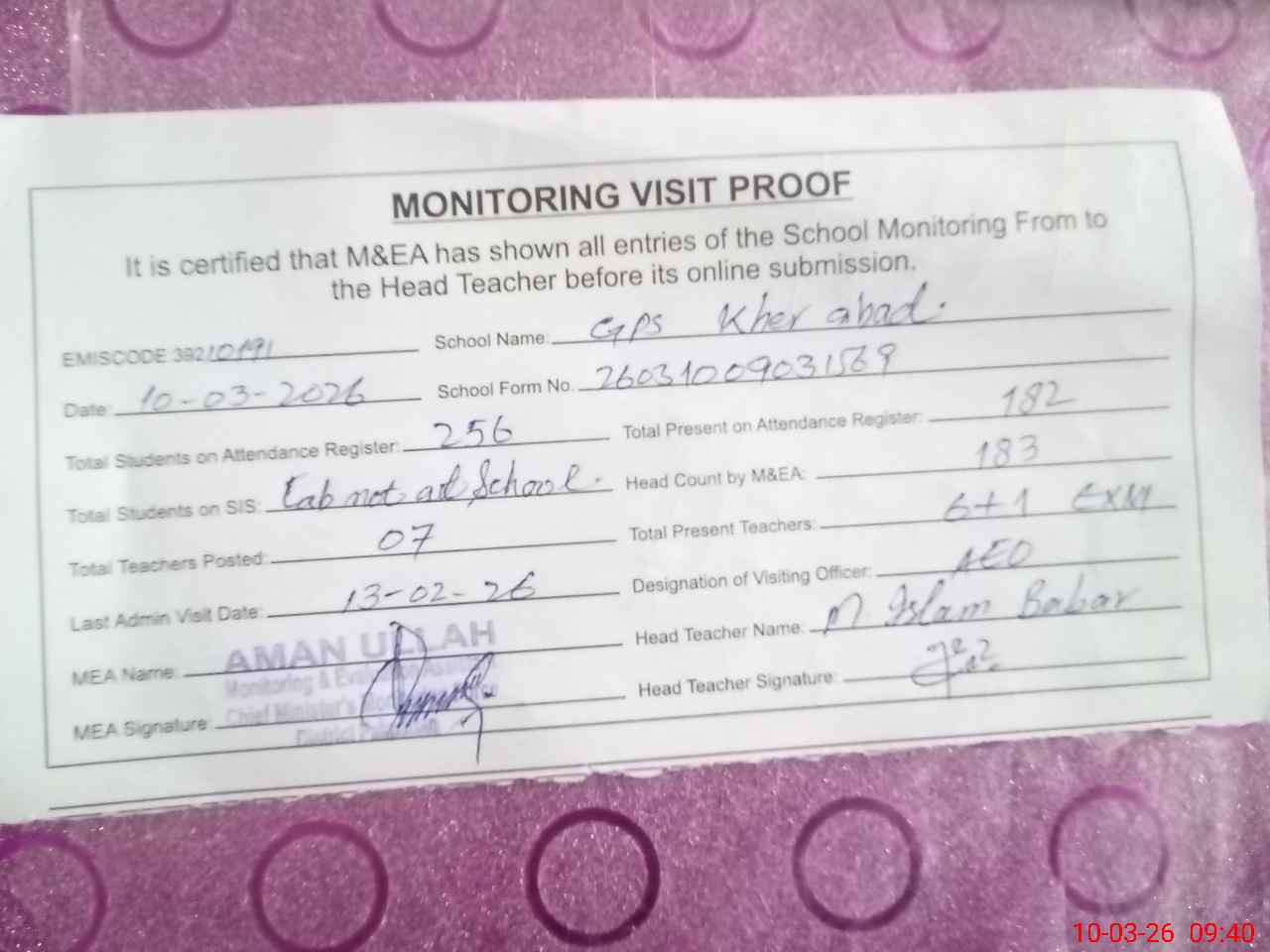 | Certified that this School was Inspected by the Undersigned MEA/DMO Today and the Information Stated Above is as Per Record. | |||||