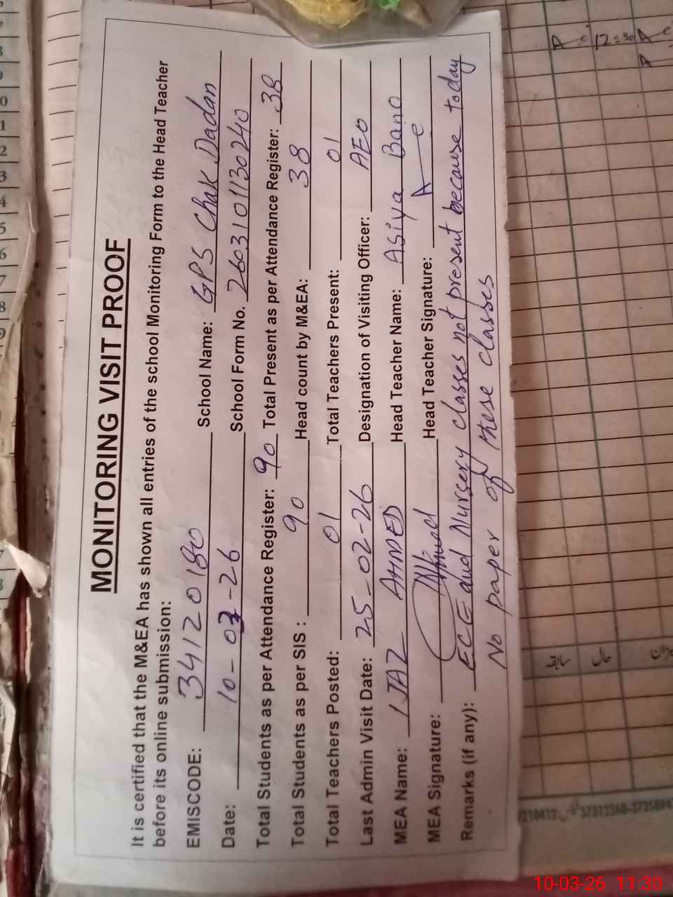 | Remarks (Use Separate Page if Required): ECE and Nursery classes not present due to no paper today | |||||