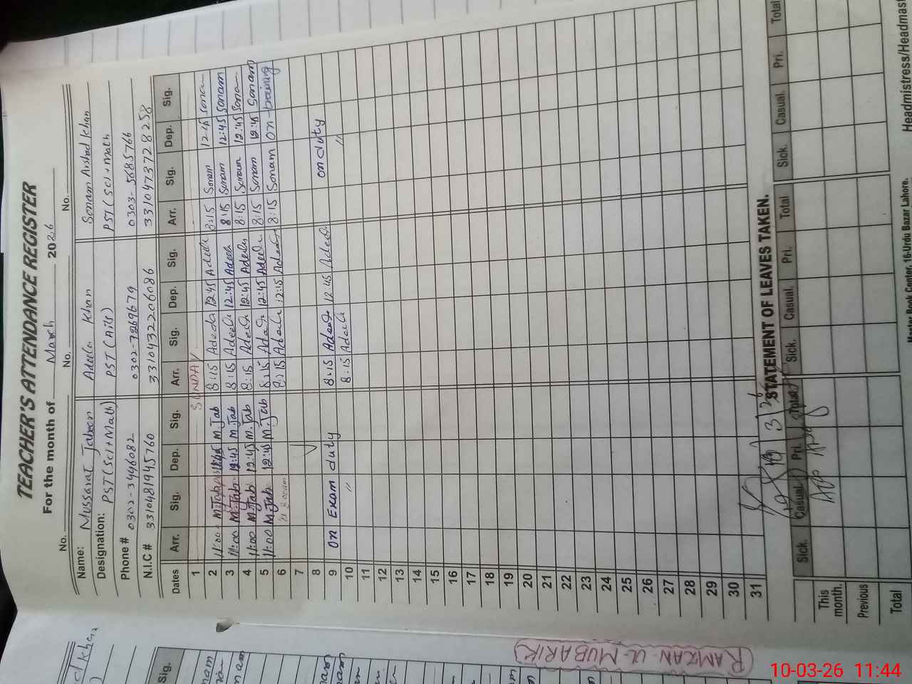 | 33**** | So**** Ar**** Kh**** | PST Science/Maths | Regular | 0 | 0 | 0 | 0 | 0 | 0 | 0 | 0 | 0 | Exam Duty |