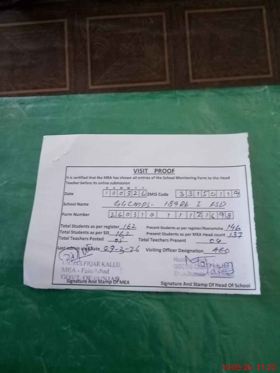 | EMIS Code: 33150119 | Name of School: GGCMS CHAK 189 RB I | |||