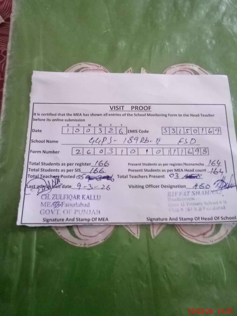| Remarks (Use Separate Page if Required): total teacher were 05 and SBA duty 02 teacher .said school exam continued and all student present boundary wall fencing broken all around | |||||