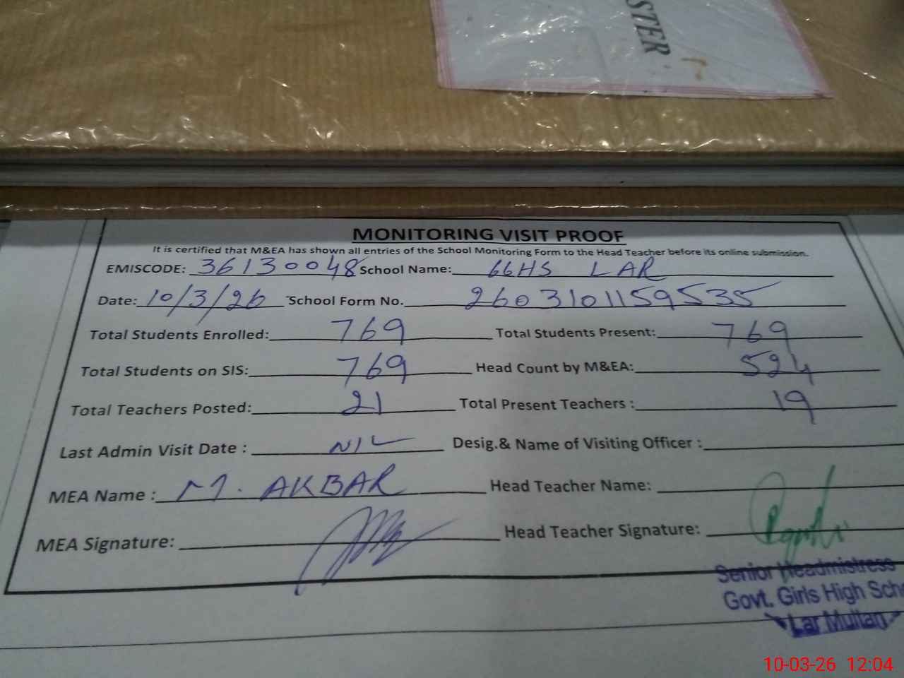 | Attendance Register | Head Teacher | MEA with School | Visit Proof |
