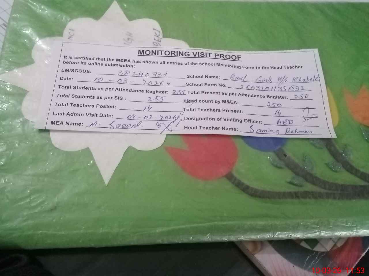 | Remarks (Use Separate Page if Required): Students on SIS QTY 255 Last admin visit On 04 February 2026 by AEO | |||||