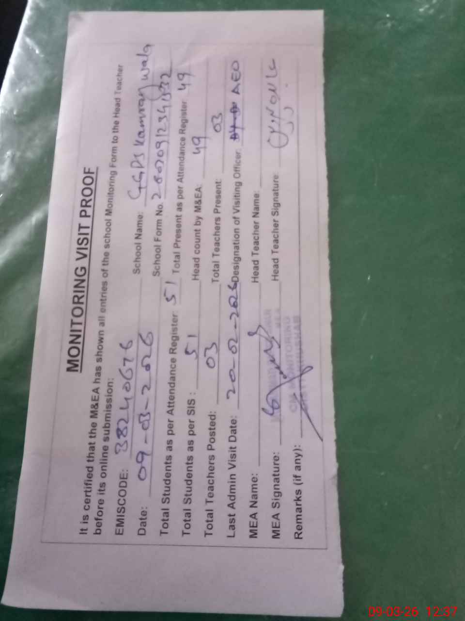 | Remarks (Use Separate Page if Required): Students on SIS QTY 51 Last admin visit On 20 February 2026 by AEO | |||||