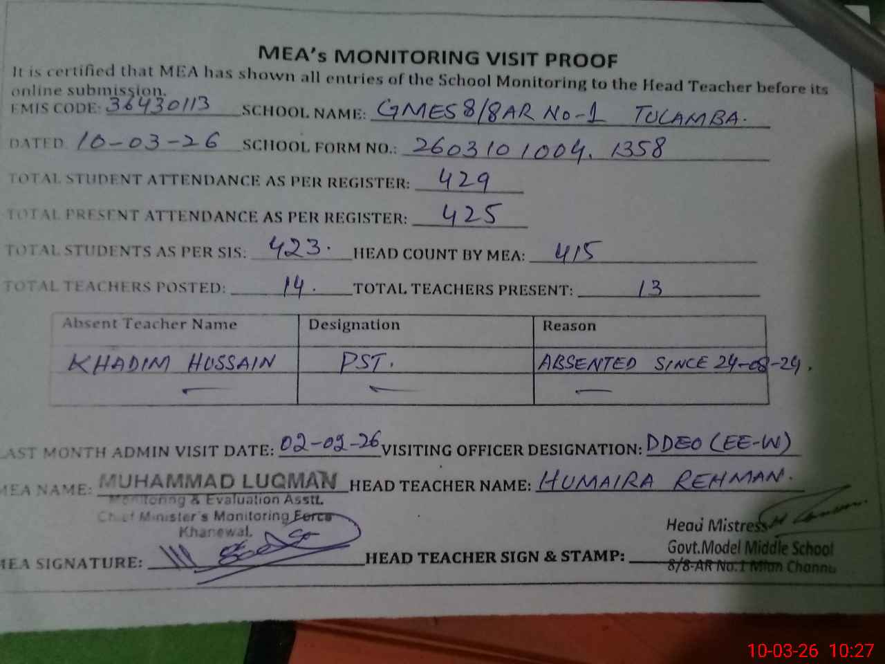 | Attendance Register | Head Teacher | MEA with School | Visit Proof |