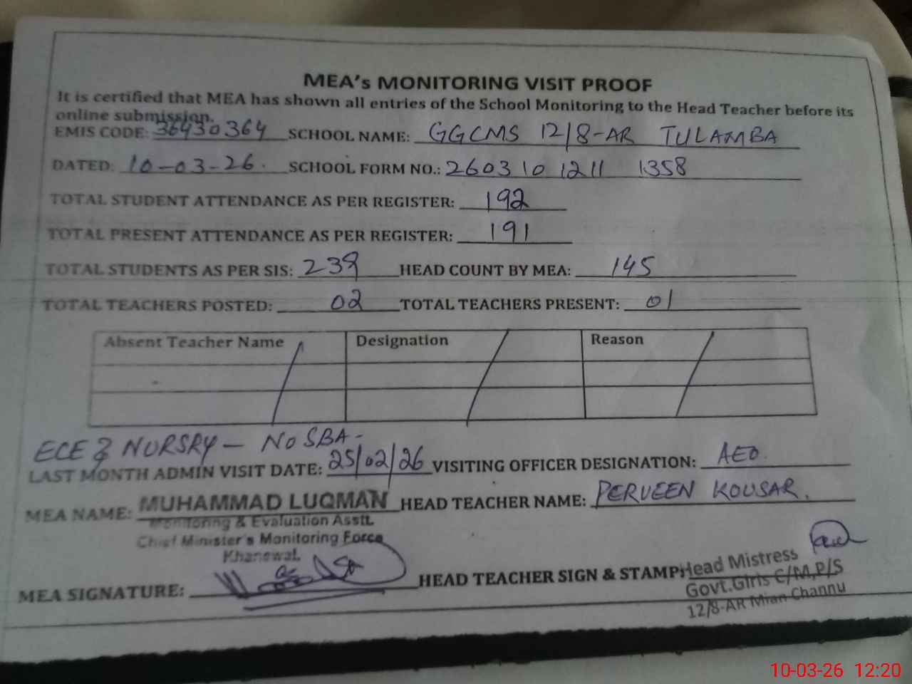 | EMIS Code: 36430364 | Name of School: GGCMS MODEL 12/8-AR TULAMBA | |||