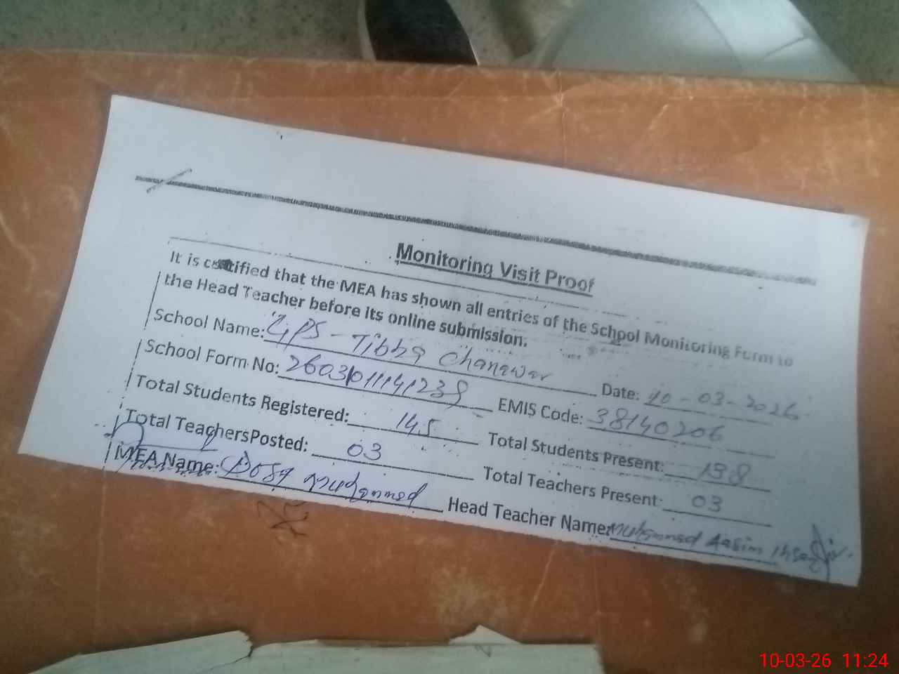 | Attendance Register | Head Teacher | MEA with School | Visit Proof |