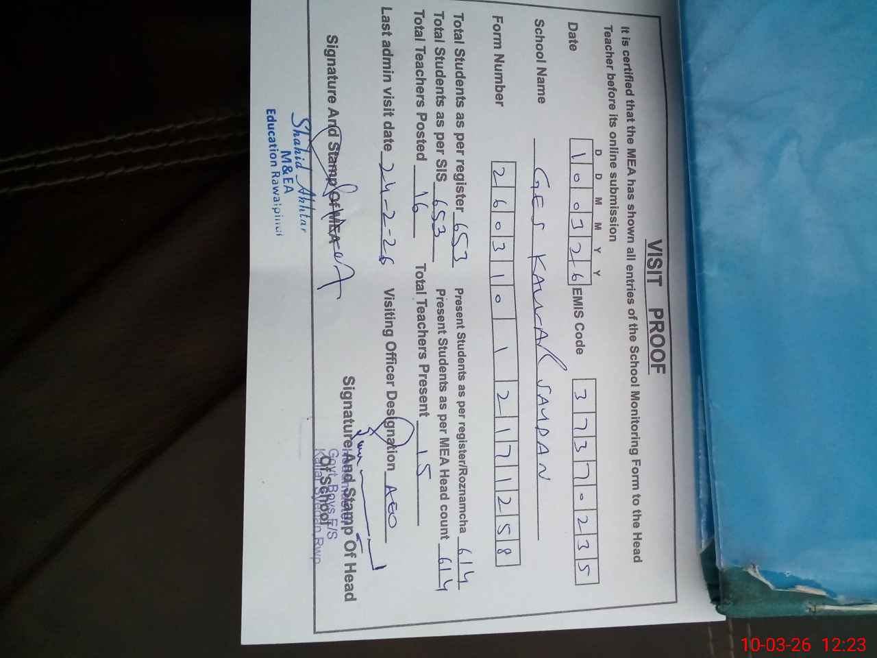| Certified that this School was Inspected by the Undersigned MEA/DMO Today and the Information Stated Above is as Per Record. | |||||