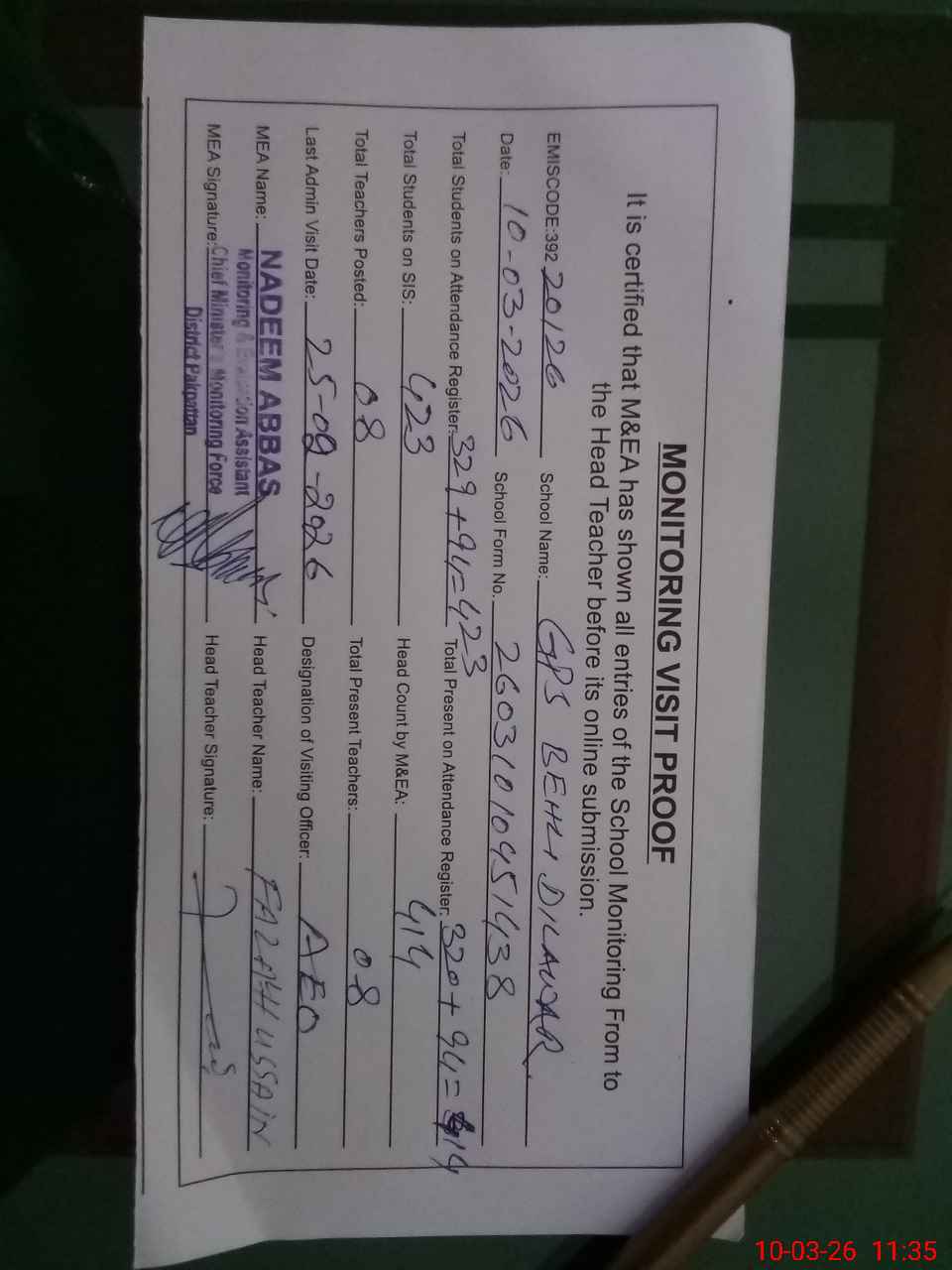 | Attendance Register | Head Teacher | MEA with School | Visit Proof |