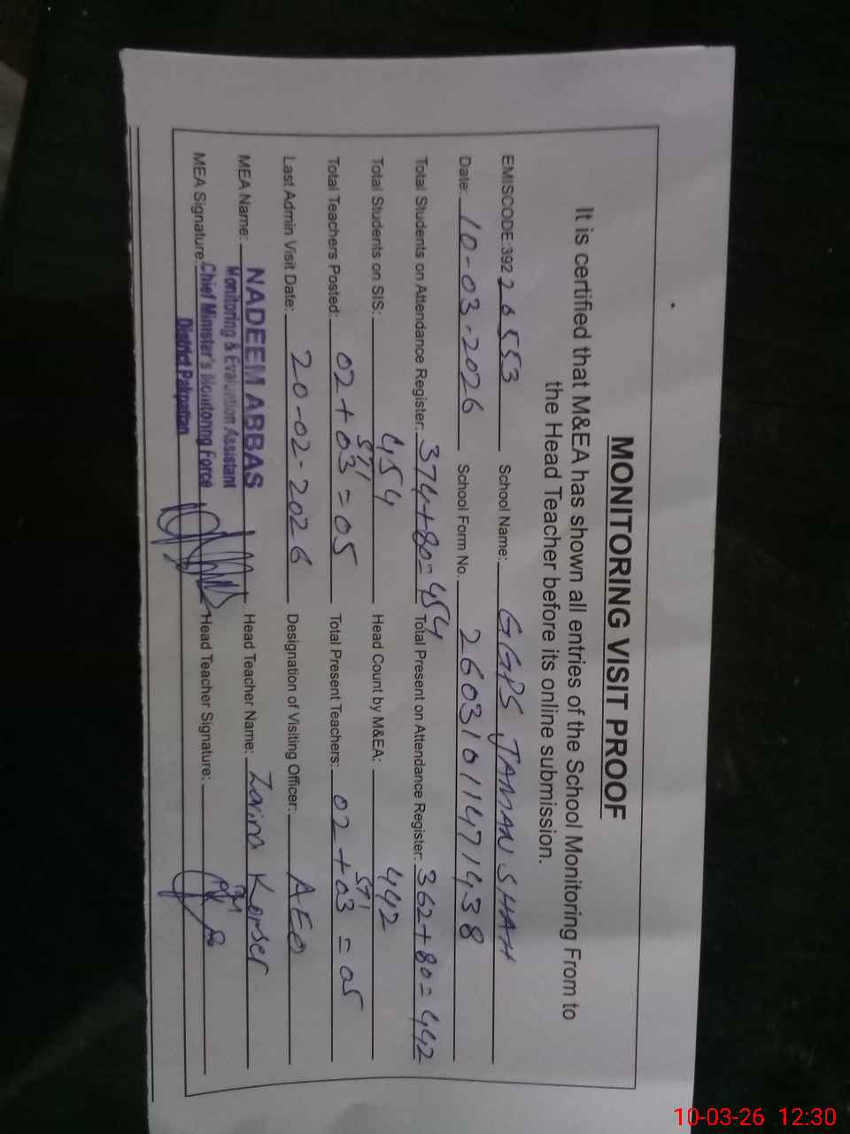 | Attendance Register | Head Teacher | MEA with School | Visit Proof |