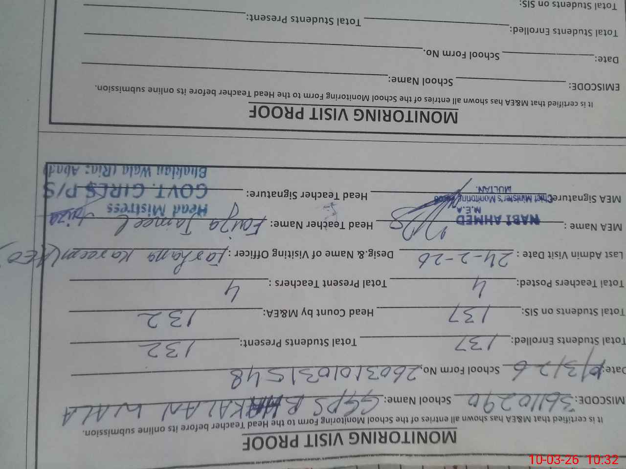 | Attendance Register | Head Teacher | MEA with School | Visit Proof |