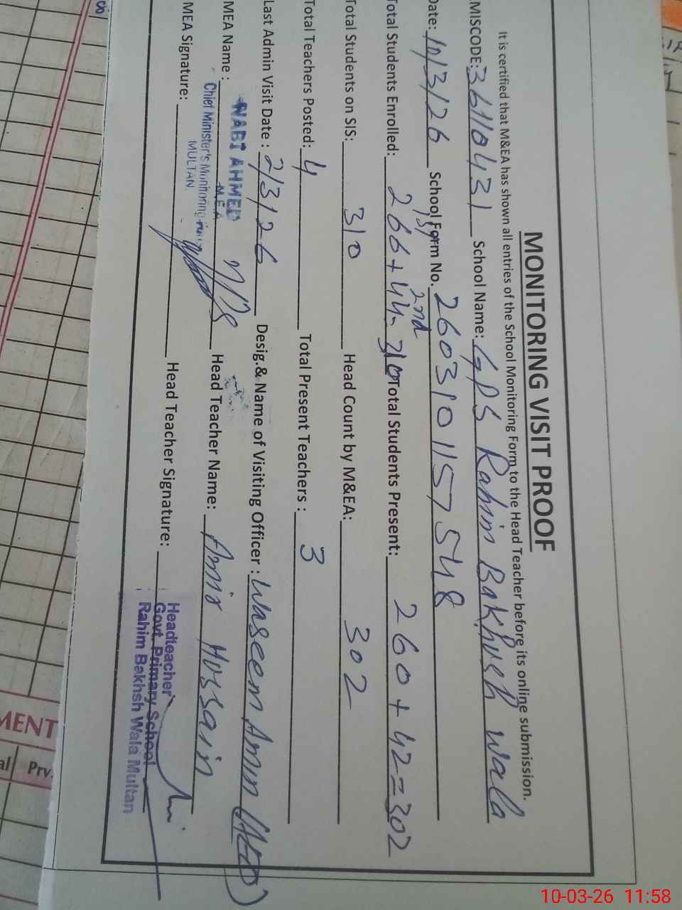 | EMIS Code: 36110431 | Name of School: GPS RAHIM BUKHSH WALA, BASTI BUTAY WALA (ALI AWAN WALA) | |||