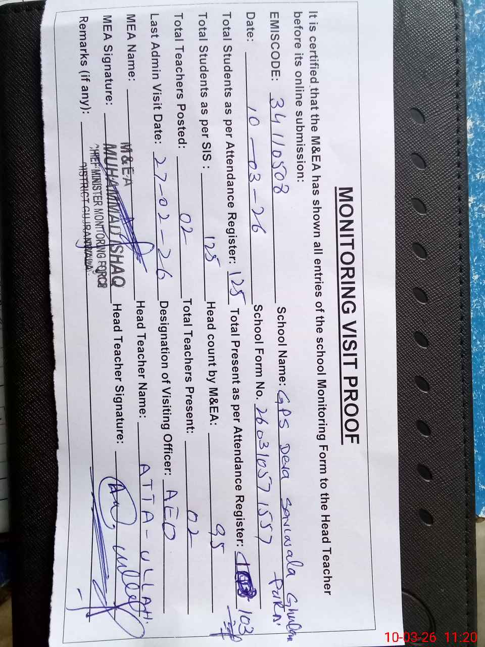 | Attendance Register | Head Teacher | MEA with School | Visit Proof |