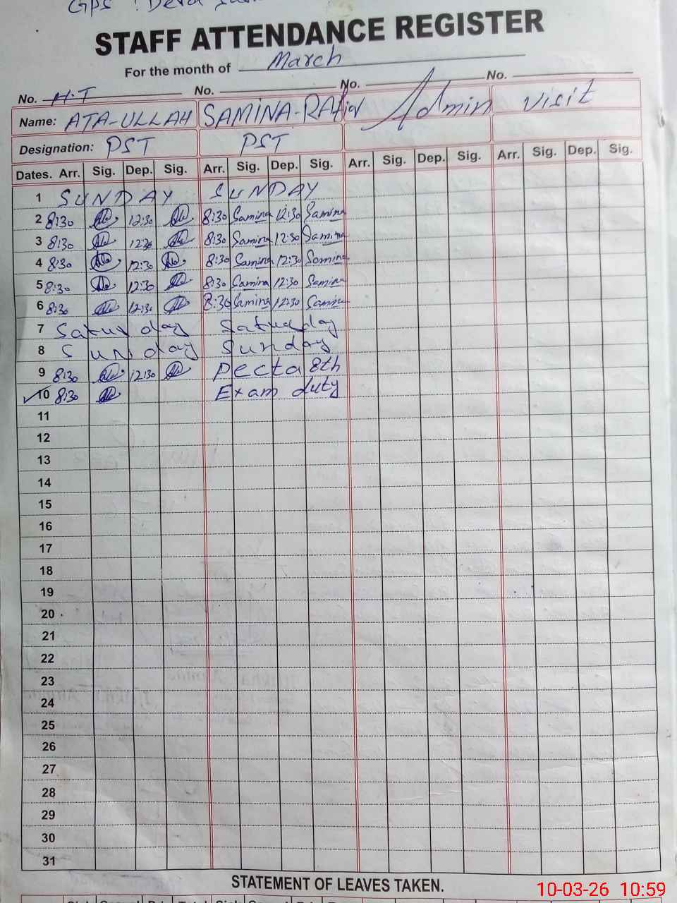 | 34**** | Sa**** Ra**** | ESE (Arts) | Contract | 1 | 0 | 0 | 0 | 0 | 0 | 0 | 0 | 1 | Exam Duty |