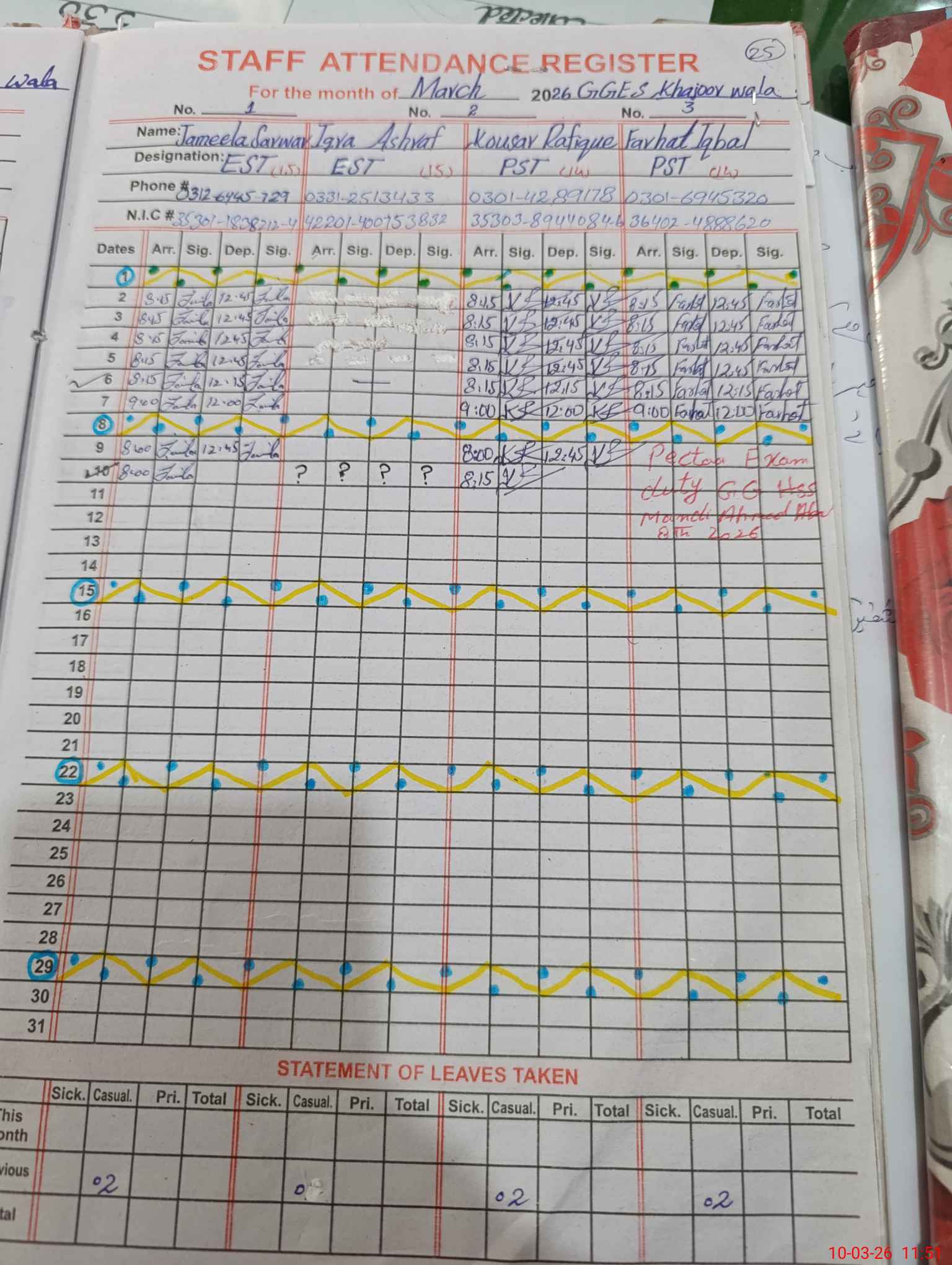 | 36**** | Fa**** Iq**** | PST Science/Maths | Regular | 0 | 0 | 0 | 0 | 0 | 0 | 0 | 0 | 0 | Exam Duty |