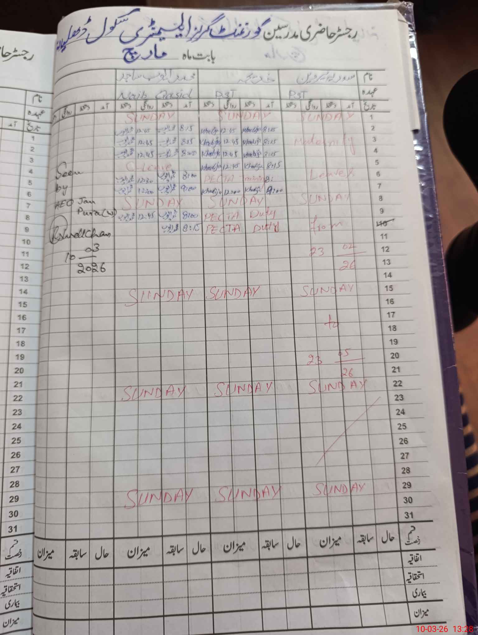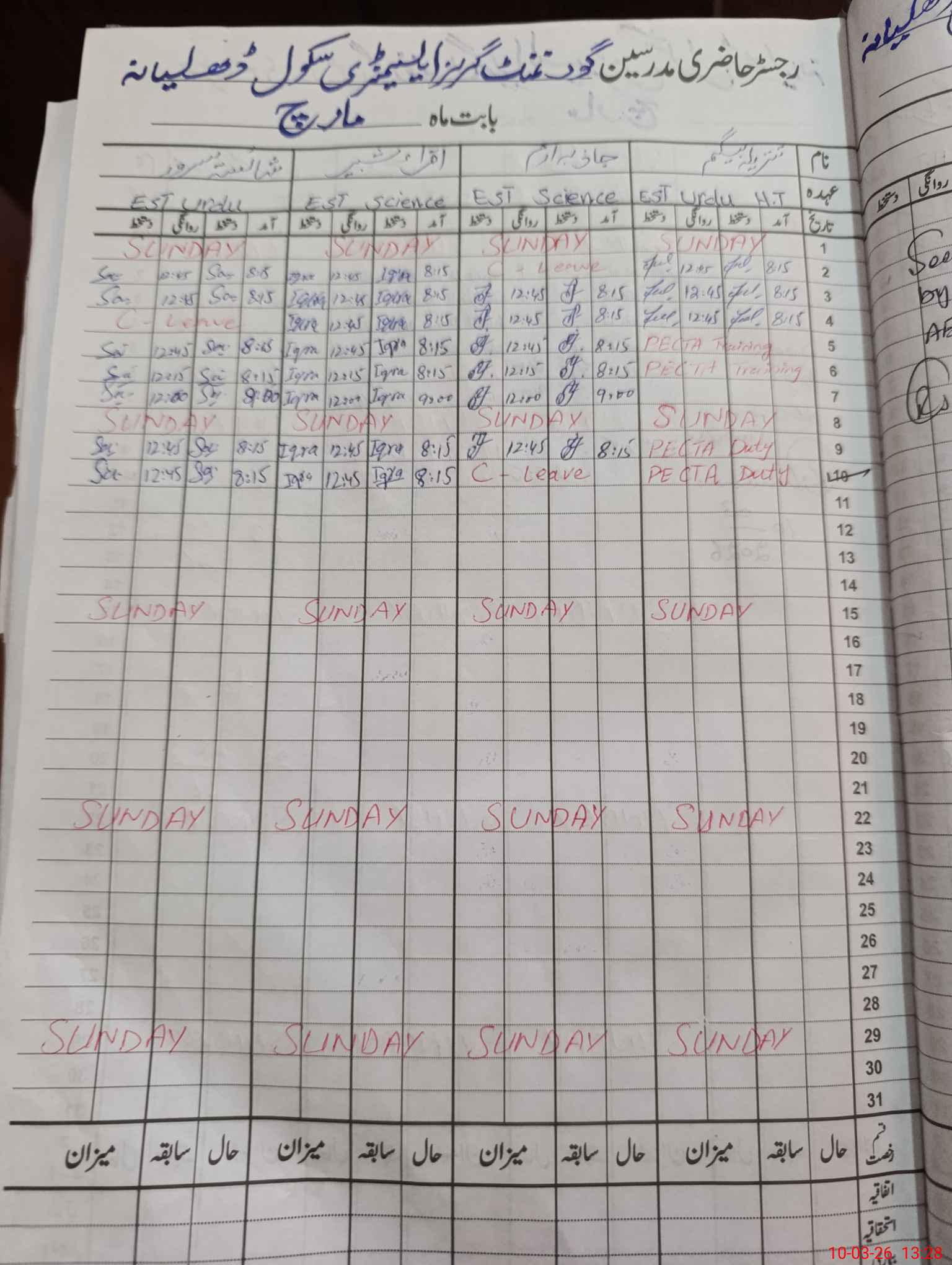 | 35**** | Sa**** Pa**** | PST Science/Maths | Regular | 0 | 0 | 0 | 0 | 0 | 0 | 0 | 0 | 0 | Maternity |