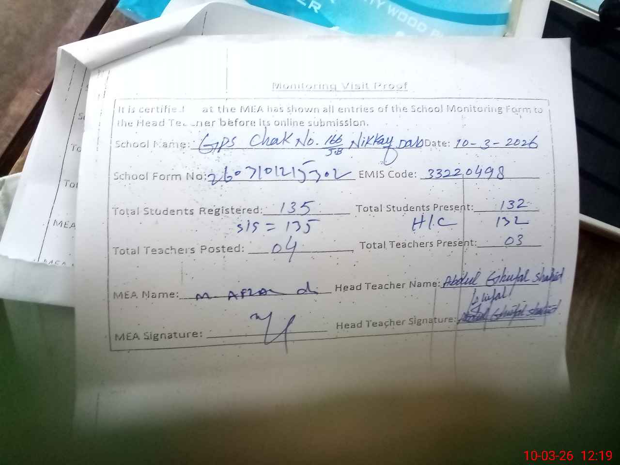 | EMIS Code: 33220498 | Name of School: GPS CHAK NO 166 JB NIKA DAB | |||