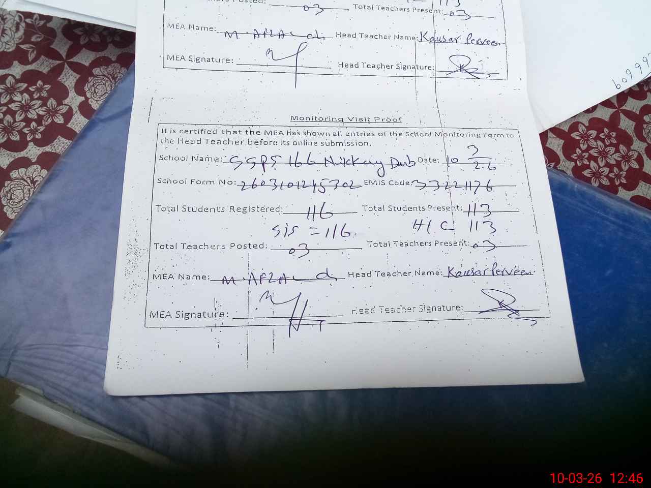 | Certified that this School was Inspected by the Undersigned MEA/DMO Today and the Information Stated Above is as Per Record. | |||||