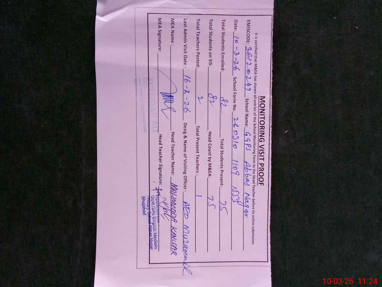 | Certified that this School was Inspected by the Undersigned MEA/DMO Today and the Information Stated Above is as Per Record. | |||||