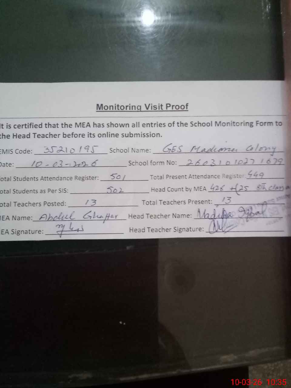 | Certified that this School was Inspected by the Undersigned MEA/DMO Today and the Information Stated Above is as Per Record. | |||||