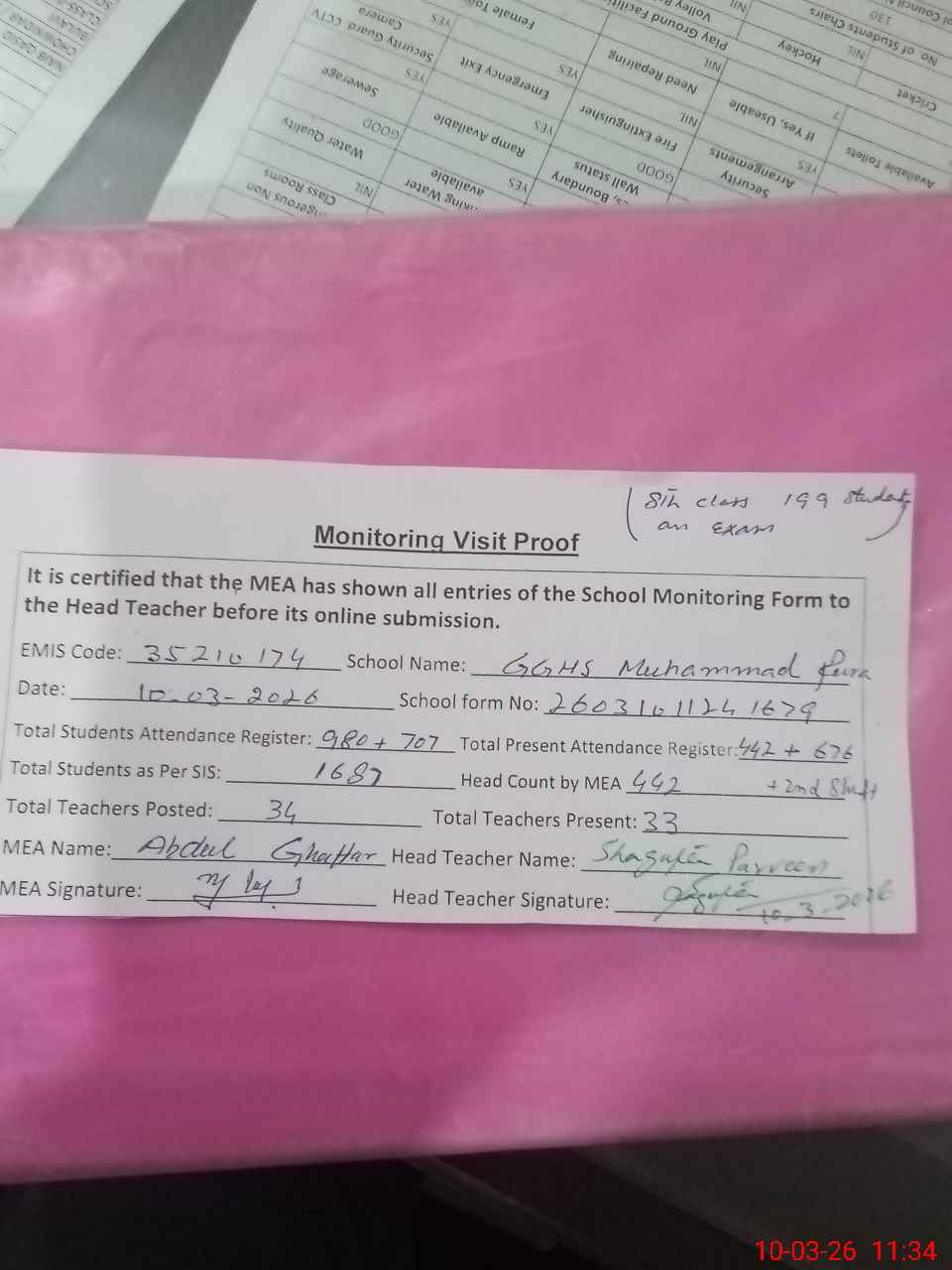 | Certified that this School was Inspected by the Undersigned MEA/DMO Today and the Information Stated Above is as Per Record. | |||||