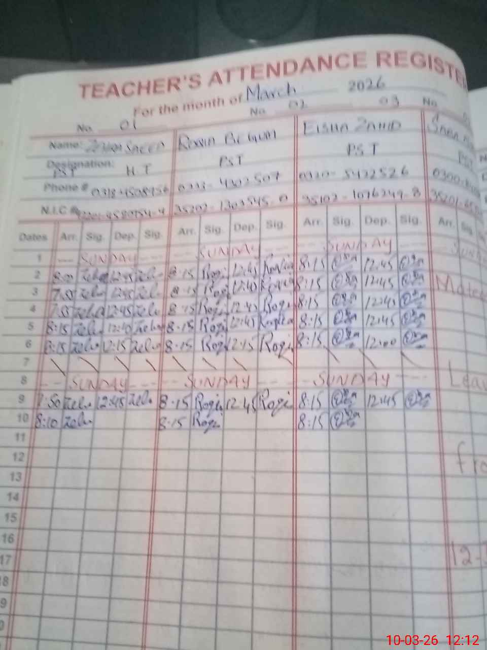 | CNIC | Full Name | Designation | R/C | Absence During Last Calender Month |