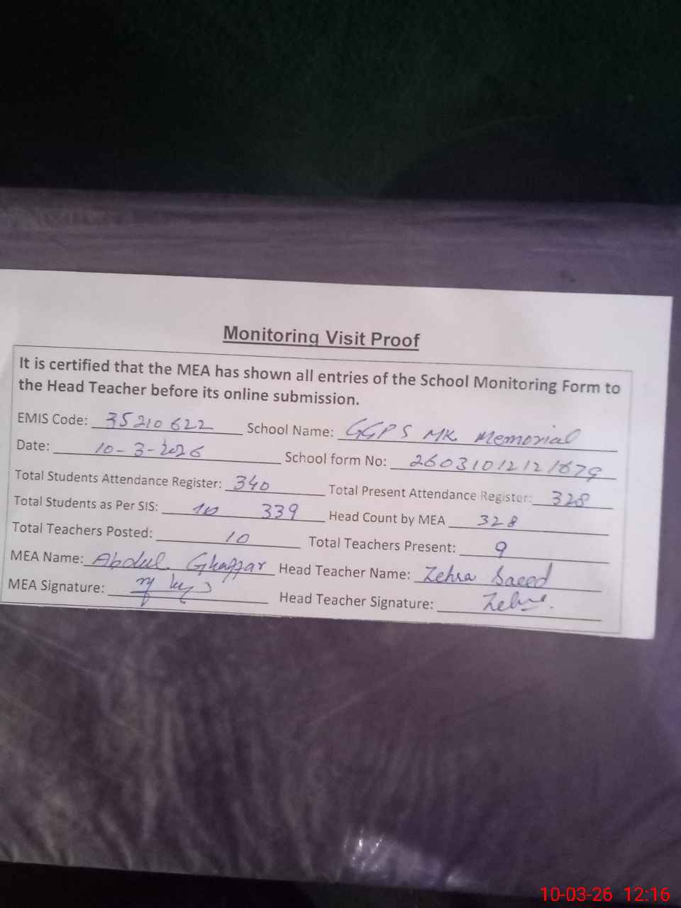 | Attendance Register | Head Teacher | MEA with School | Visit Proof |